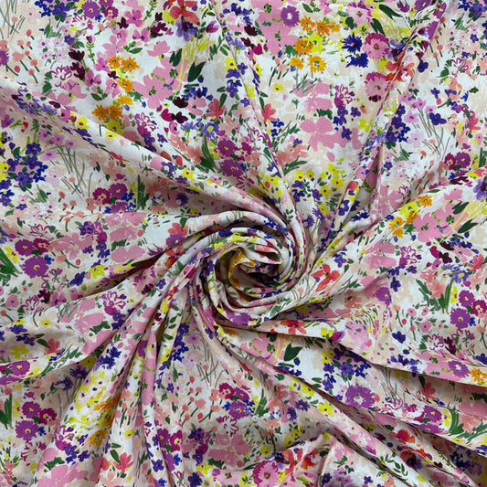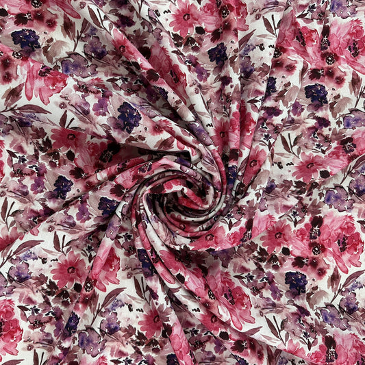 Watercolour Florals - White, Pink & Purple - Linen Blend Slub