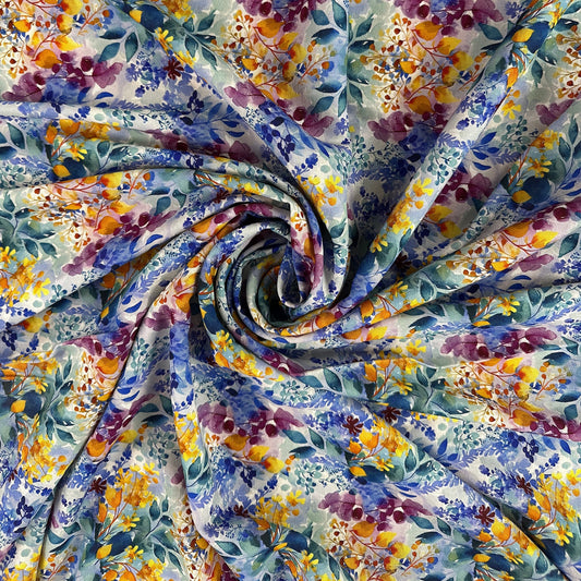 Watercolour Florals - Blue & Yellow - Linen Blend Slub