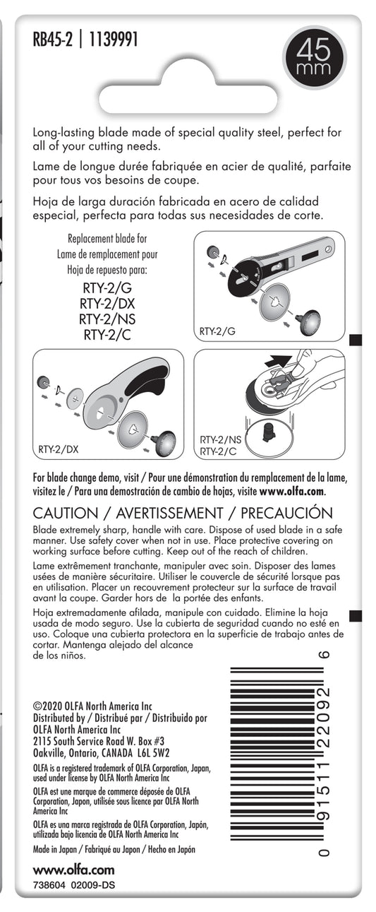 Olfa - 45mm Endurance Rotary Blade - Cuts twice as long - 2 pack