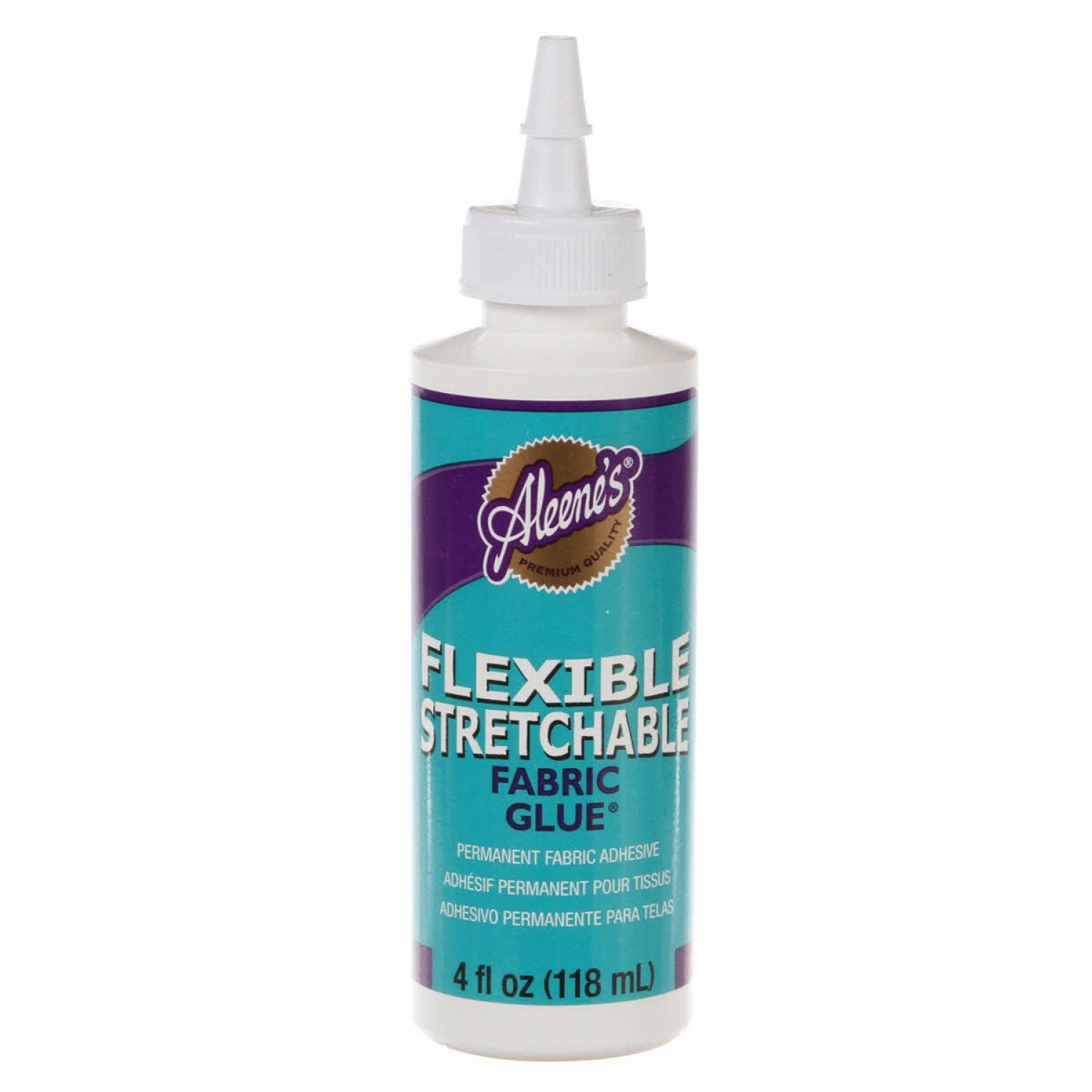 Aleene's Flexible Stretchable Fabric Glue is a permanent fabric glue that is used to decorate and embellish T-shirts, knits and other stretchable fabrics. Gives without cracking or breaking away from the fabric. Can withstand repeated delicate hand washings. Not for use on bathing suits. Dries Clear. Non-toxic. 4 oz.