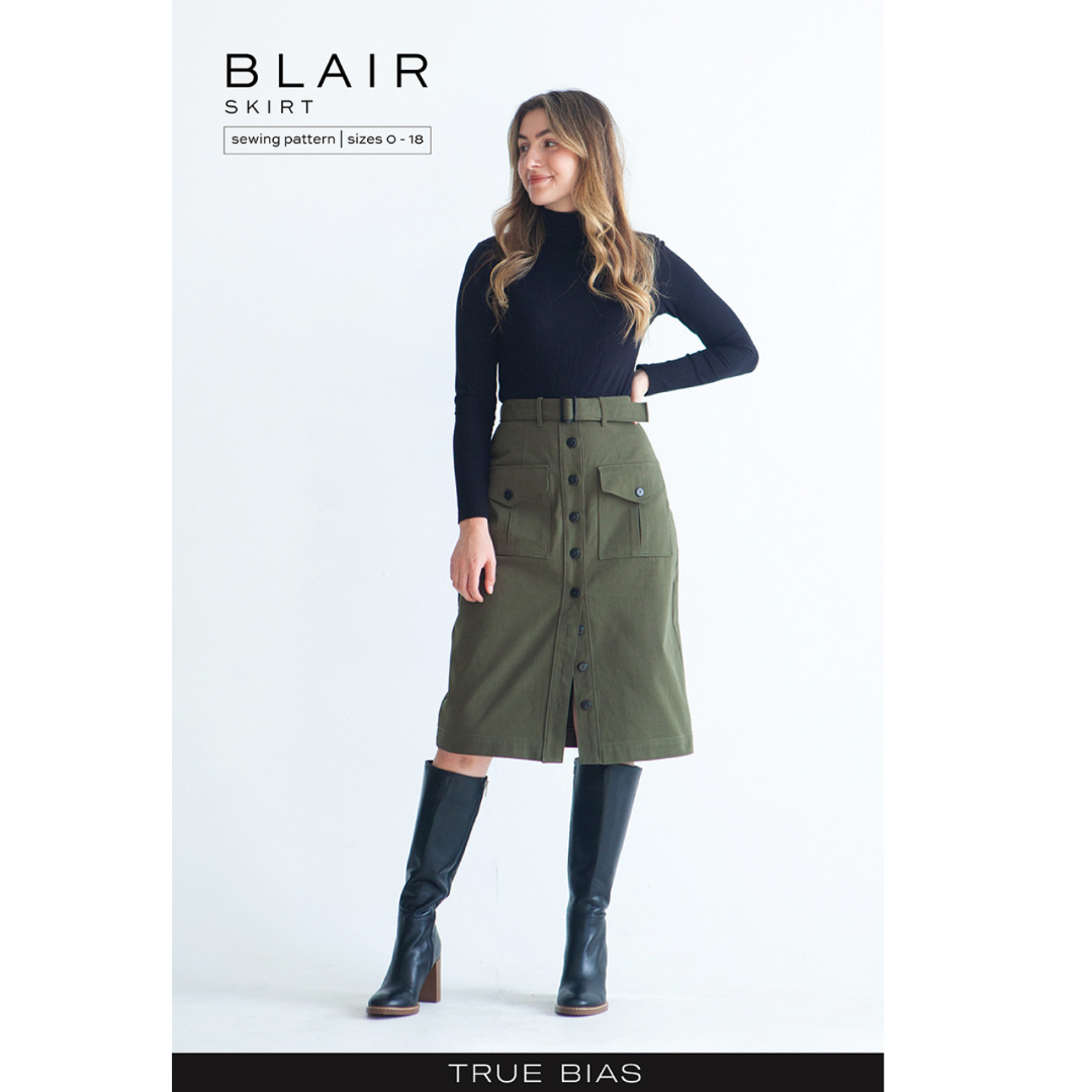 The Blair pattern is a woven skirt that is fitted through the waist and hips and has a straight fit to the hem. It has a button-front opening and belt loops. There are three length options : mini, midi, and maxi. All views have optional pockets with inverted pleats, and a belt.