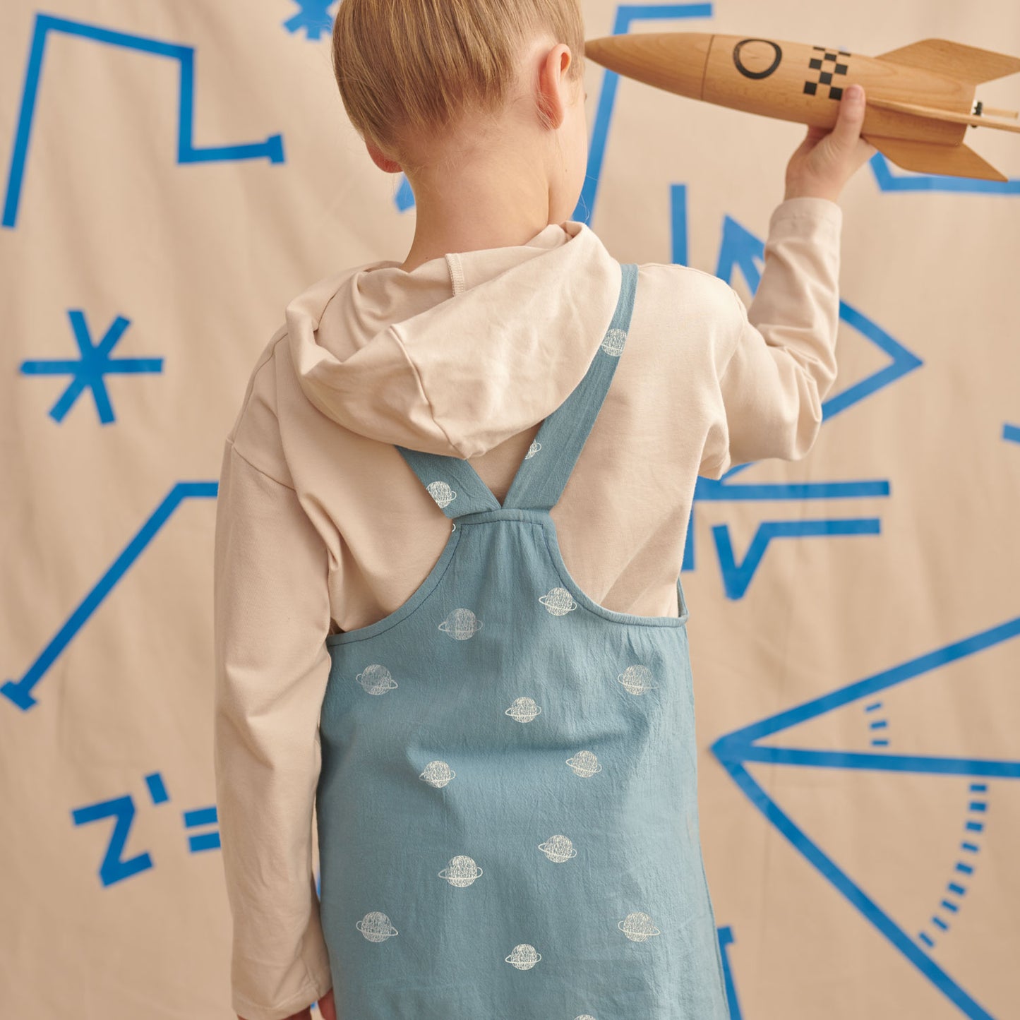 100% rustic effect cotton with a higher gram weight than our normal poplin. Design with the planet Saturn on a blue background. Ideal for sewing clothing like dresses, jumpsuits and home accessories.