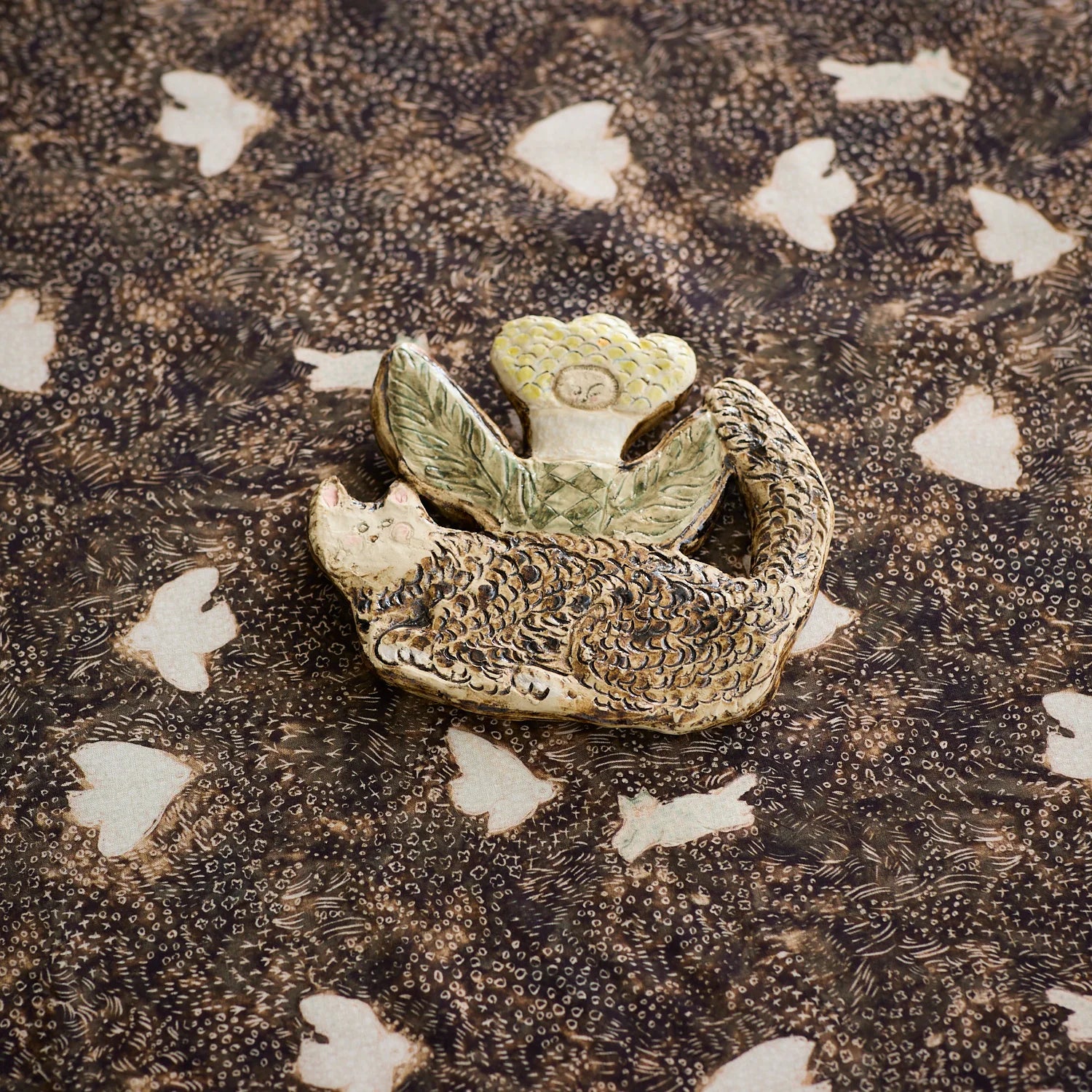 A collaboration textile between KOKKA and porcelain artist Mizacosha. This design features playful shadows of kittens hiding among bird silhouettes, with a charming handcrafted touch that reflects Mizacosha’s unique style.