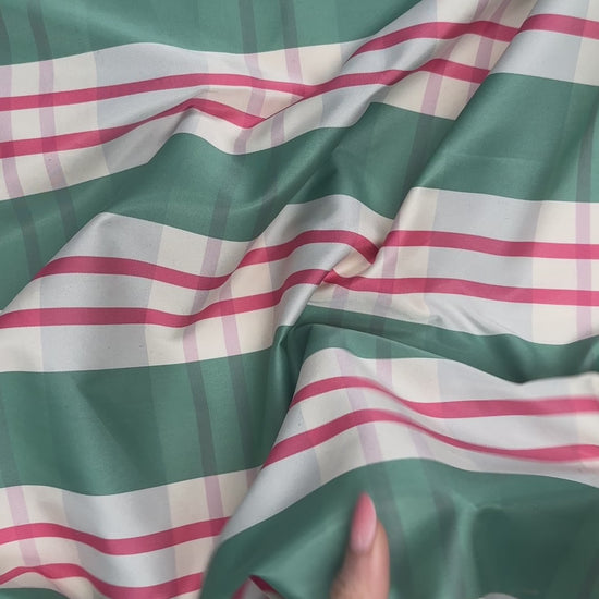A crisp, lightweight polyester taffeta featuring a classic plaid with a fresh, modern palette. The fabric has a smooth, lightly lustrous surface and a structured drape that holds shape beautifully, making it ideal for garments and projects that benefit from volume and definition.