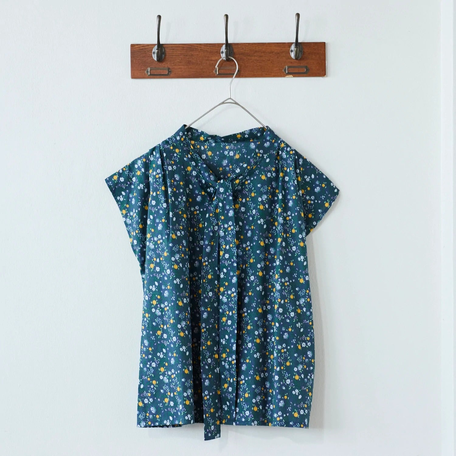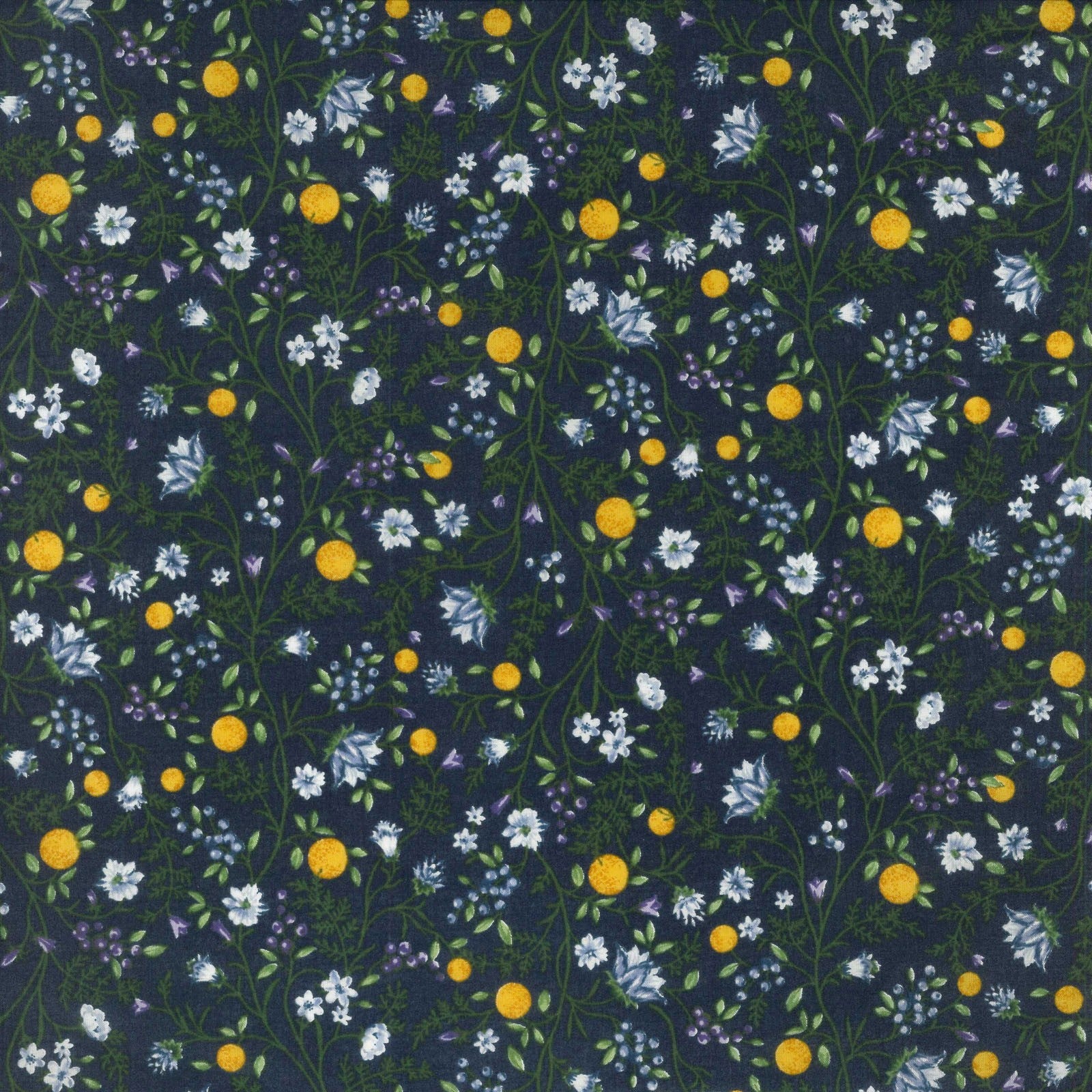 Fruit vines on a navy blue backgrounds. Oranges, blue flowers and foliage/vines.