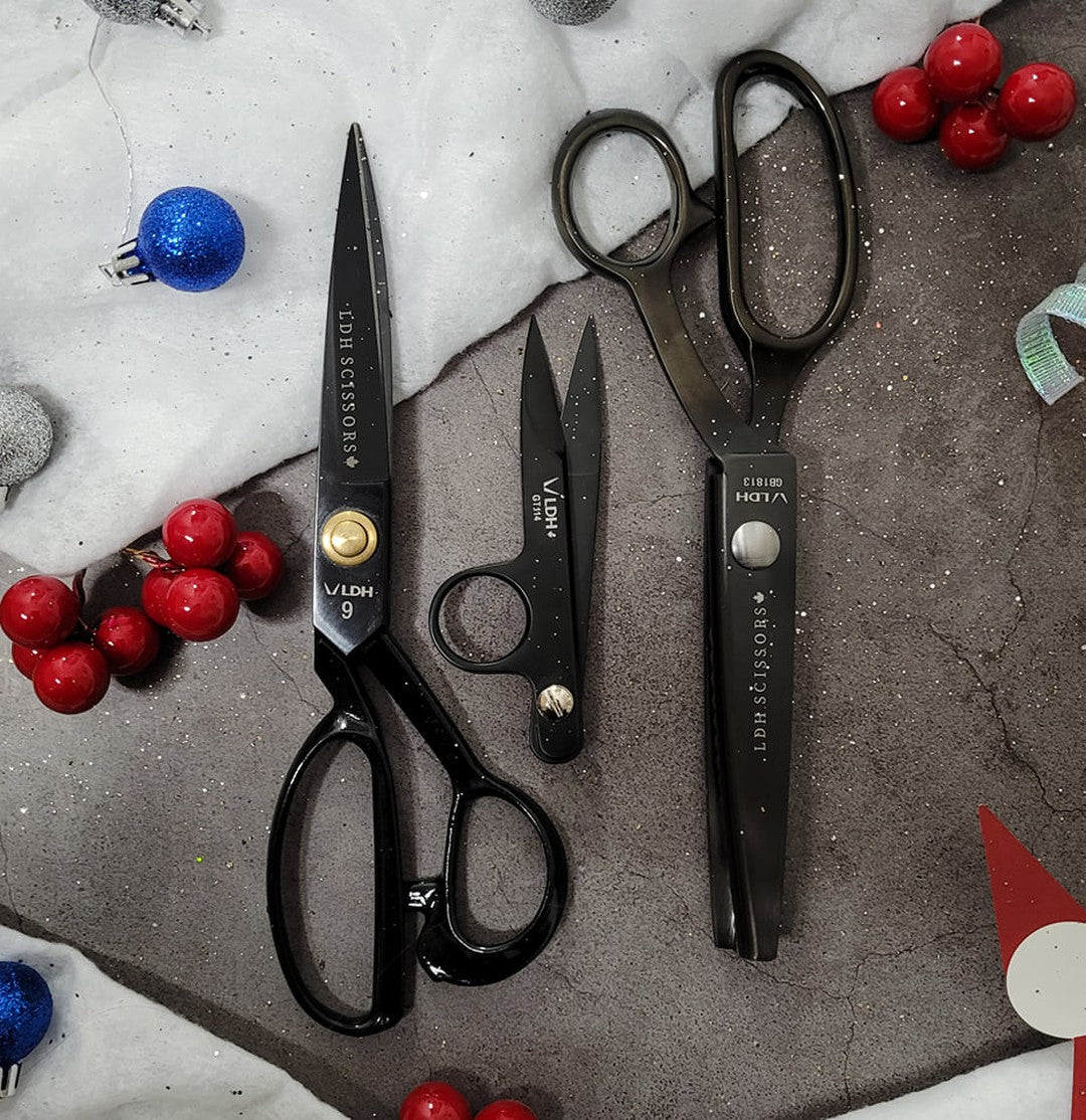 Midnight Edition Fabric Shears are made out of carbon steel. Our Midnight Edition Pinking Shears and Thread Snip are made out of stainless steel.