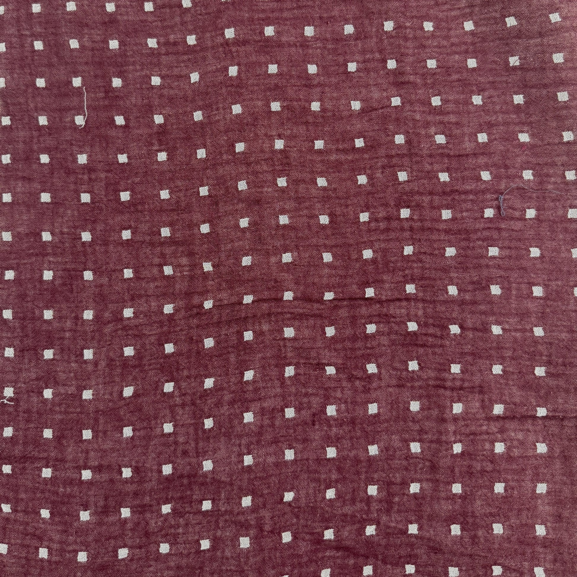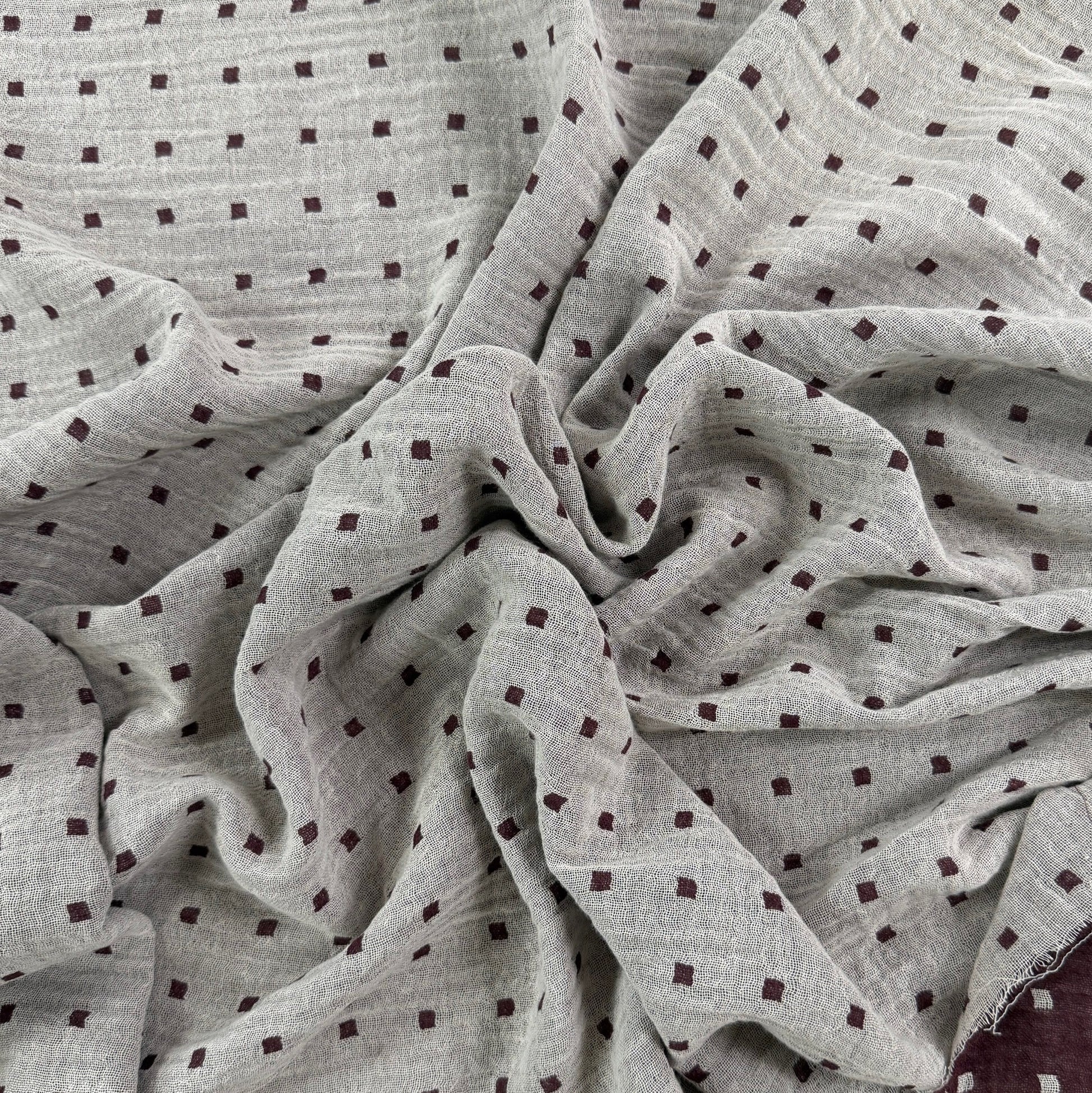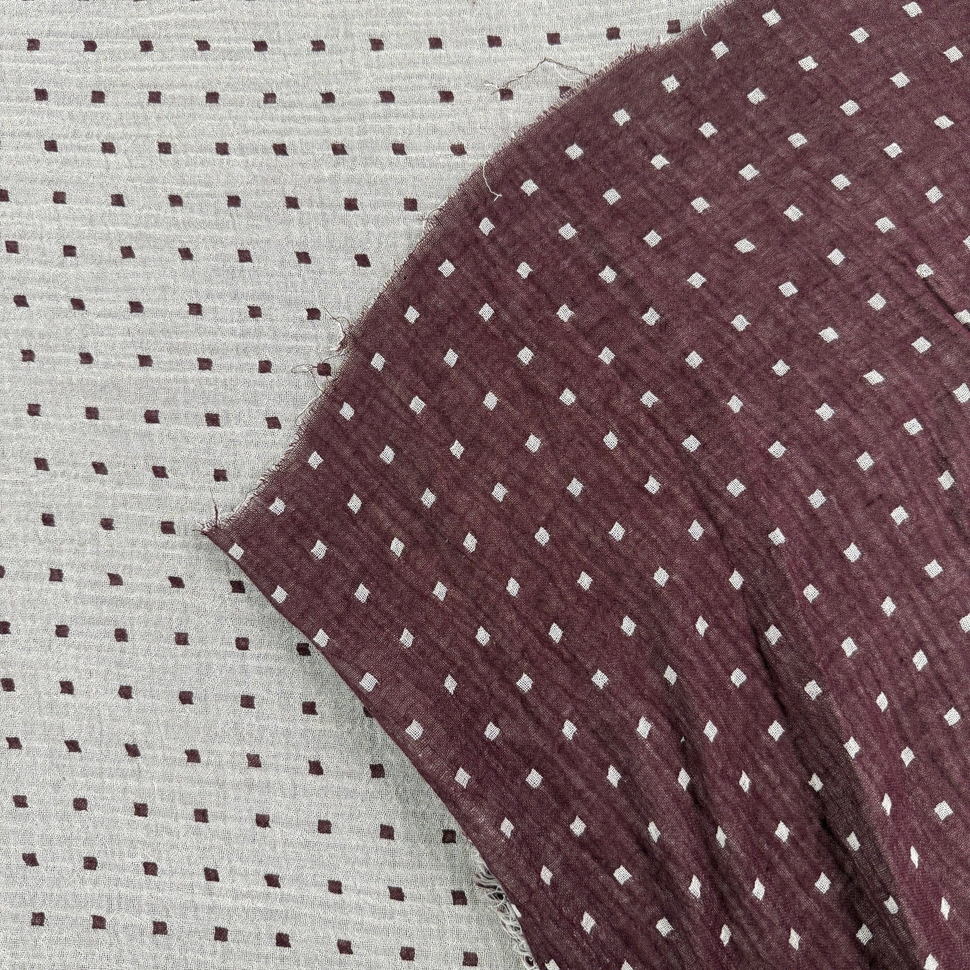 Double sided, reversible double gauze fabric featuring small repeating squares. One side is burgundy and the other side is a light grey/ivory. Lightweight, flowy and soft, this fabric is perfect for warm weather garments or casual wear.