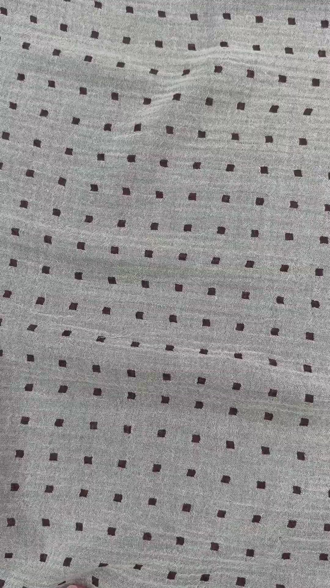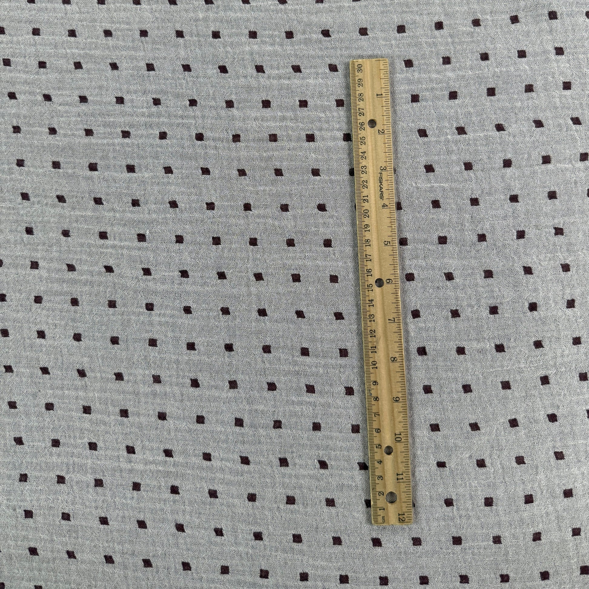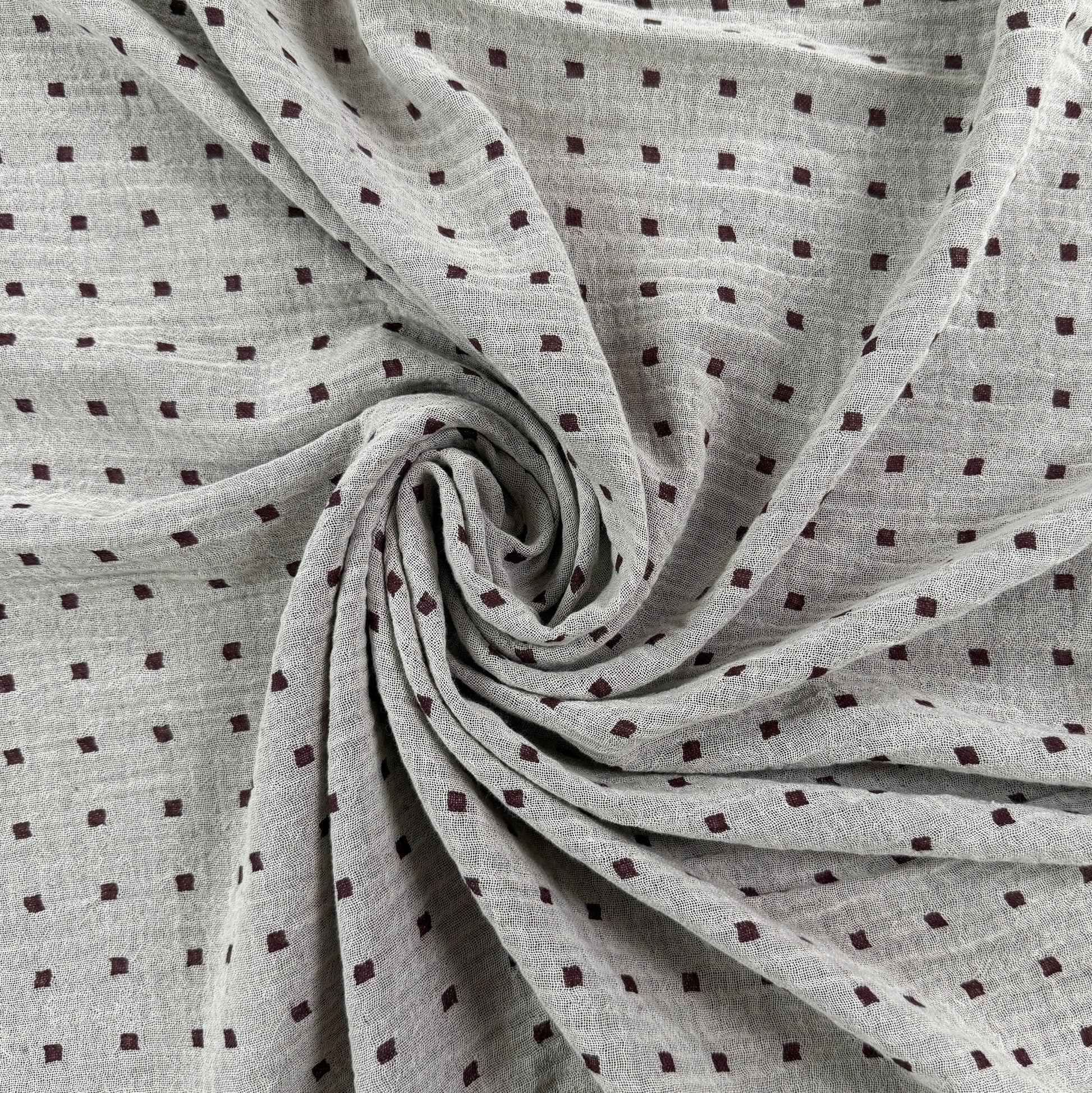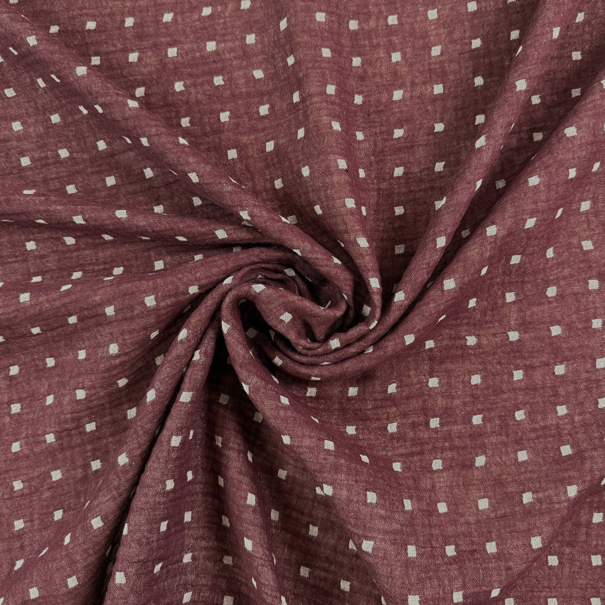 Double sided, reversible double gauze fabric featuring small repeating squares. One side is burgundy and the other side is a light grey/ivory. Lightweight, flowy and soft, this fabric is perfect for warm weather garments or casual wear.