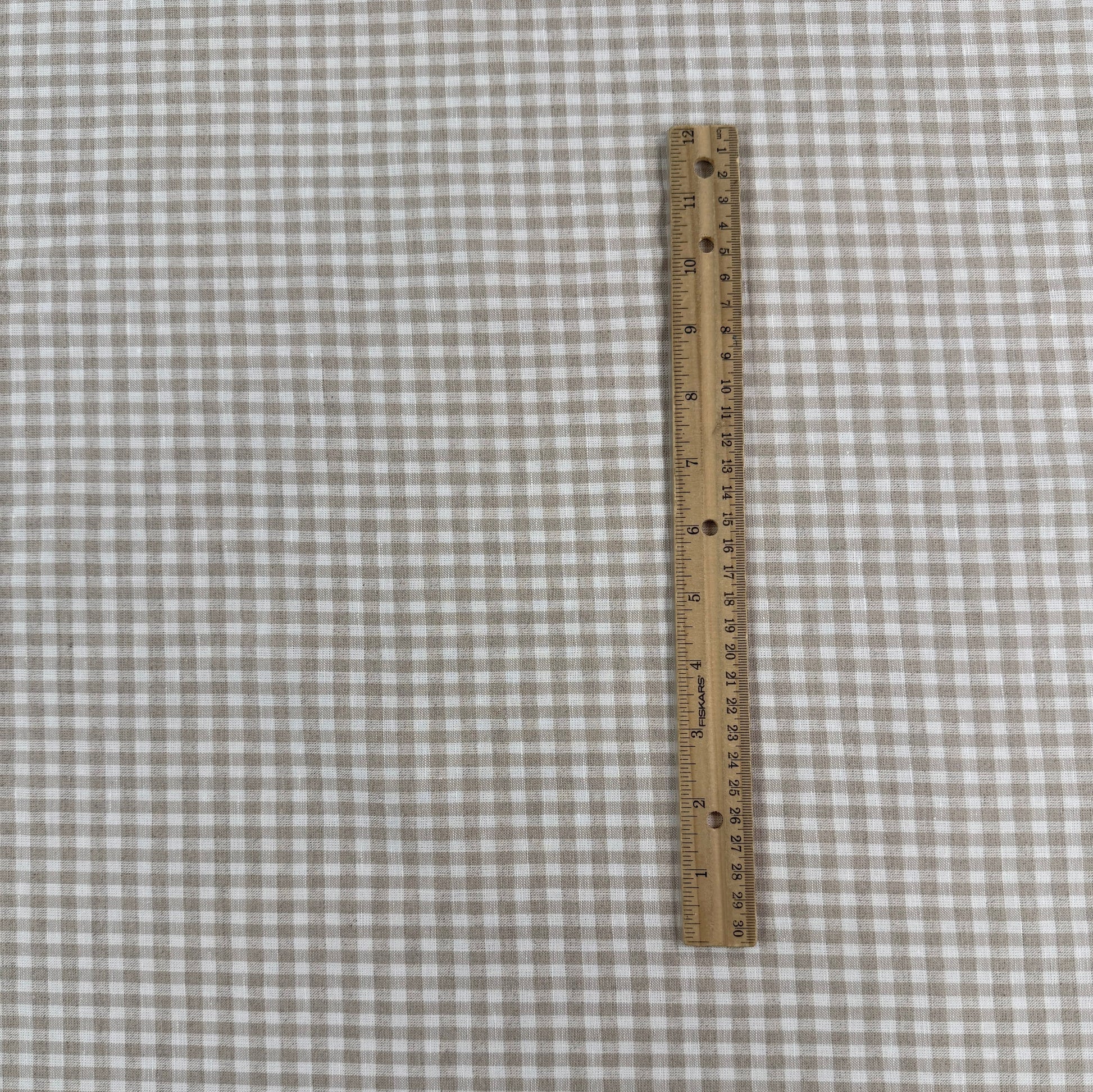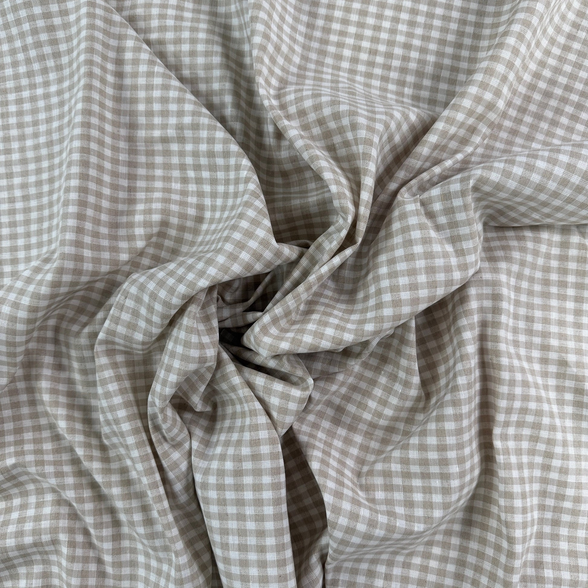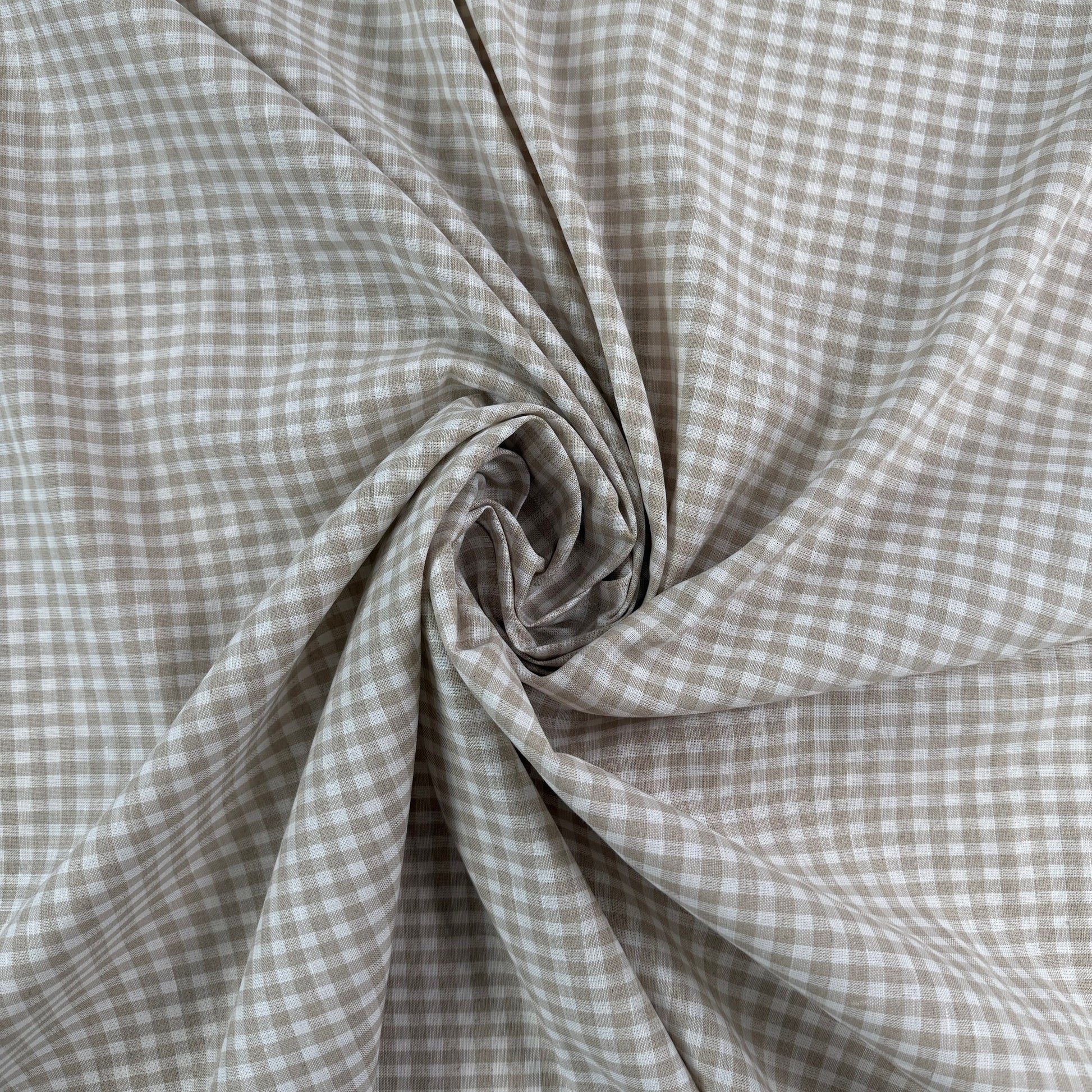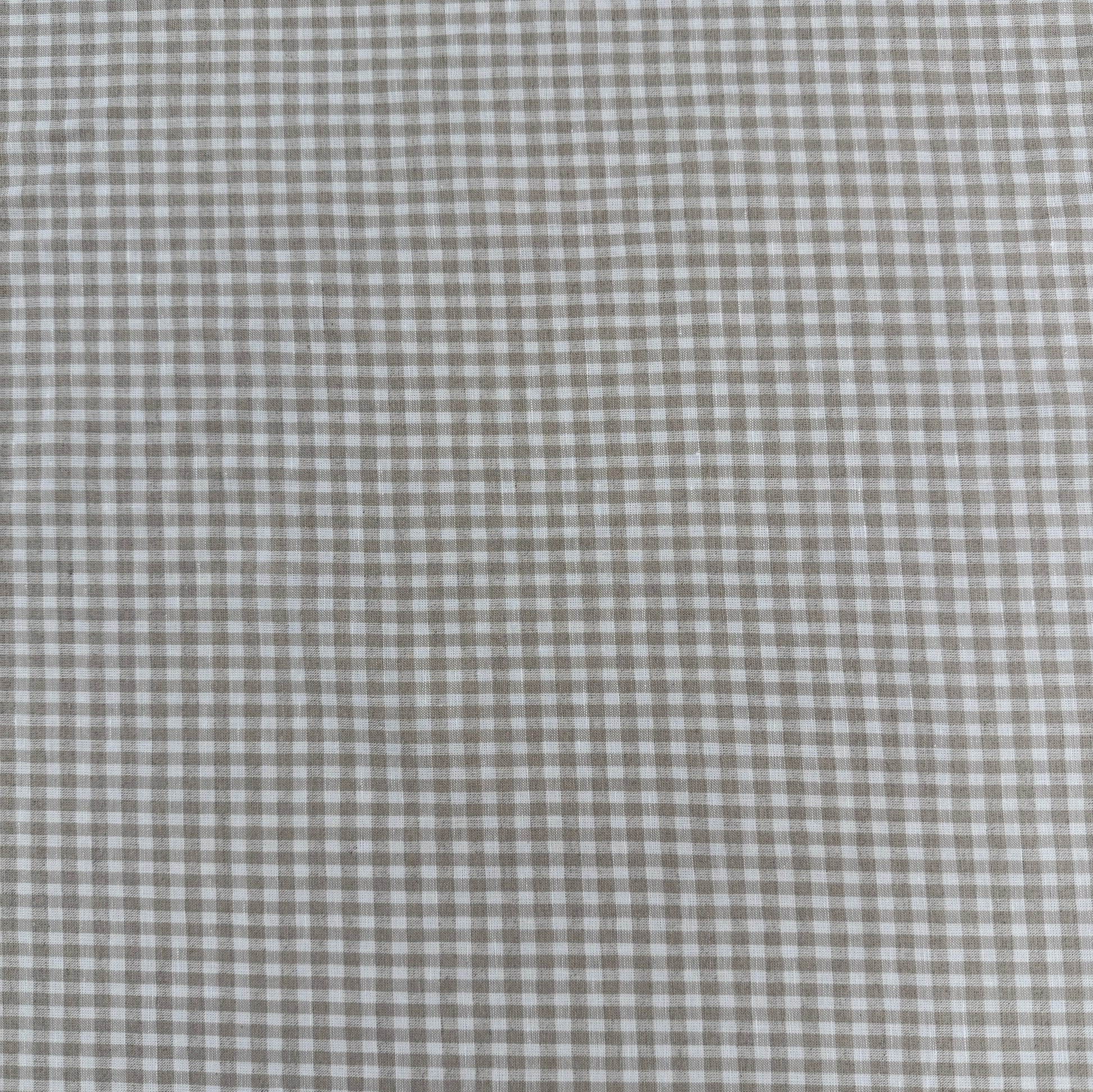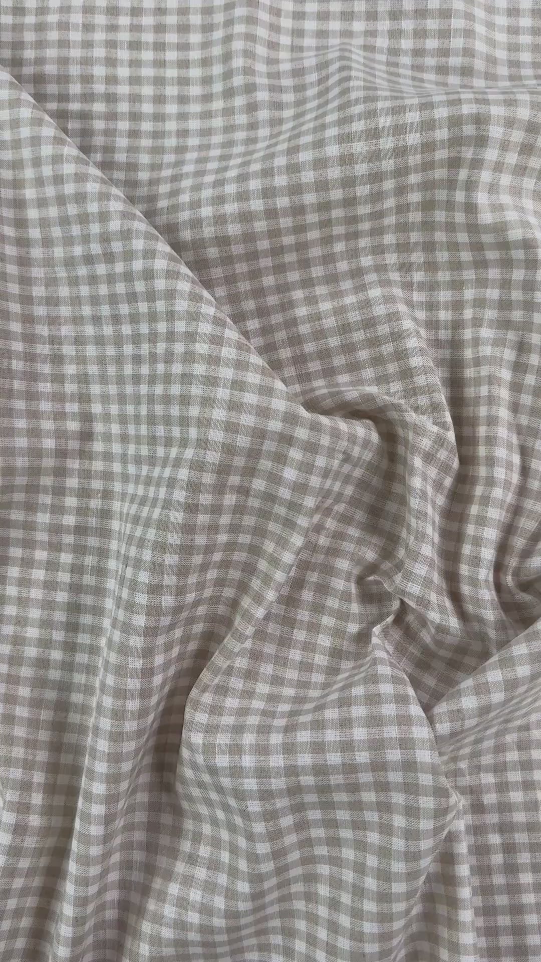 Cotton and linen fabric with a classic gingham print in beige and white. Breathable, soft and lightweight, this fabric is a versatile choice for warm weather or transitional garments. Use it for skirts, dresses, pants & more.