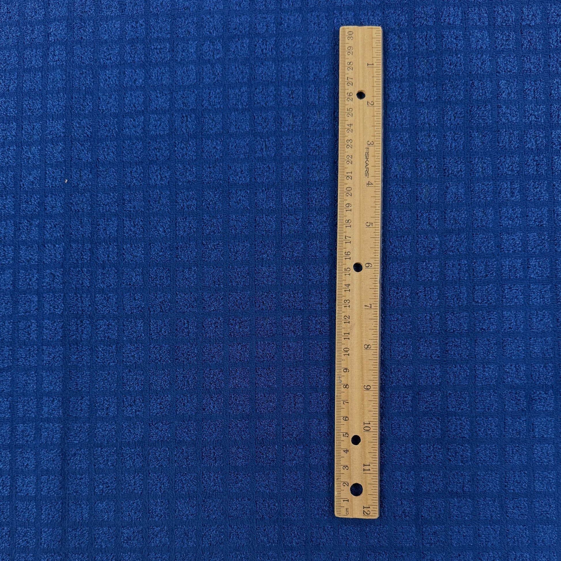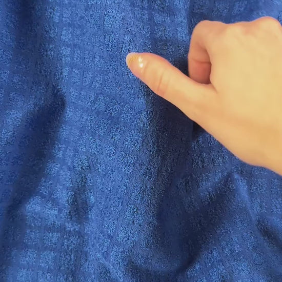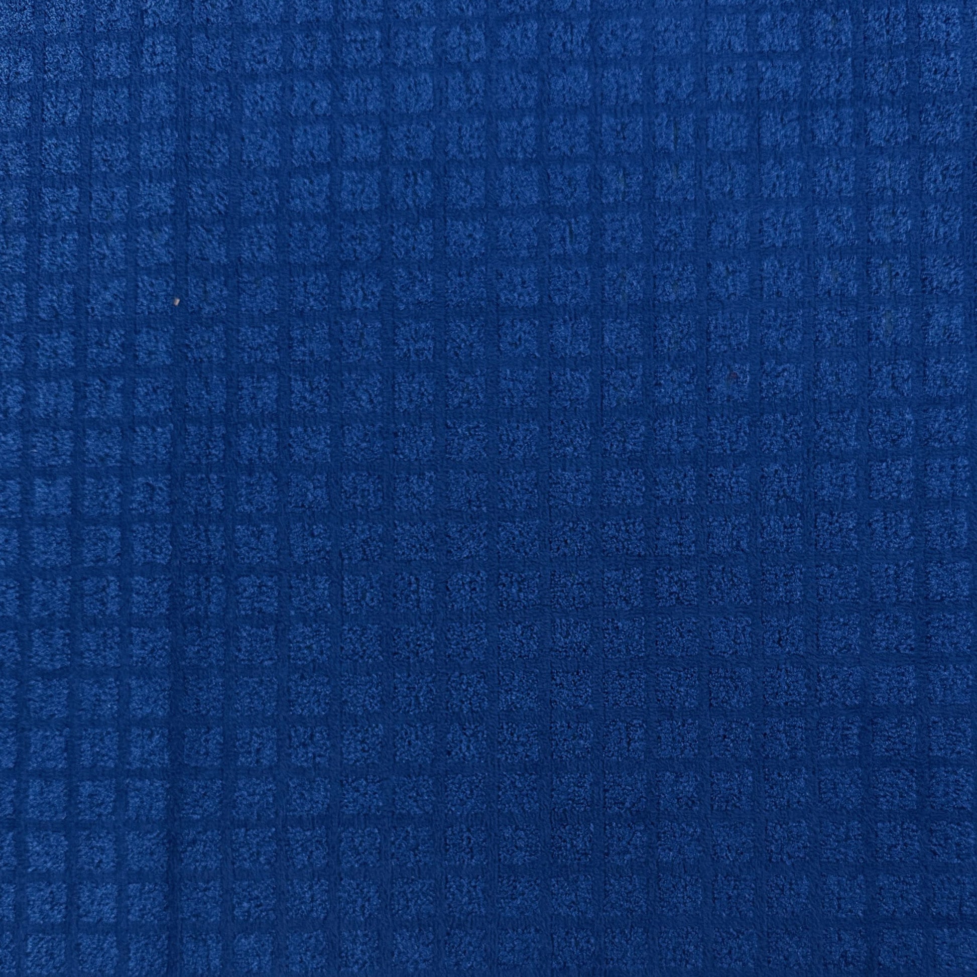 A heavy weight upholstery fabric in blue featuring a check pattern and velvety finish. Suitable for homewear such as cushions, reupholstering, etc. Can also be used for heavier coats and jackets.