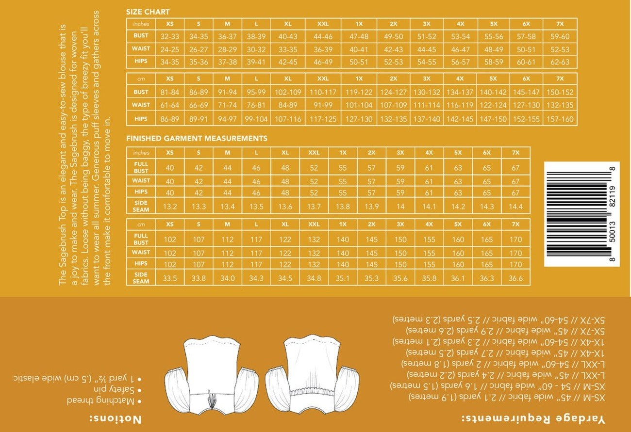 The Sagebrush Top is an elegant and easy-to-sew blouse that is a joy to make and wear. The Sagebrush is designed for woven fabrics and looks great in breezy fabrics like cotton voile, as well as more structured fabrics like a crisp linen. The simple design of the top lends itself well to customization. Loose without being baggy, the type of breezy fit you’ll want to wear all summer. Generous puff sleeves and gathers across the front make it comfortable to move in. The tie at the back neckline makes it simple and cute! The Sagebrush looks great tucked into something high waisted. This top was drafted using sample measurements for a B cup and a height of 5’6”.