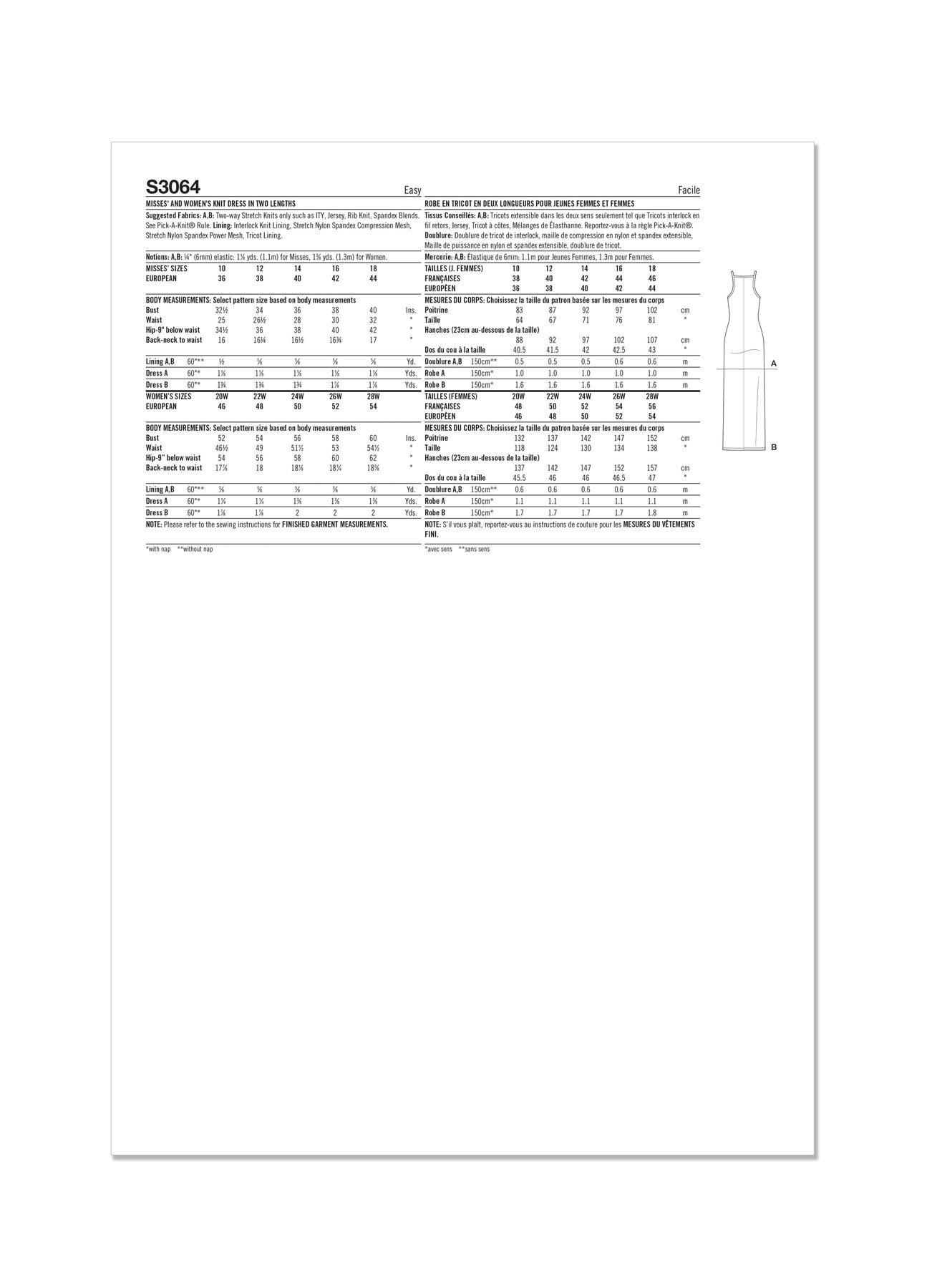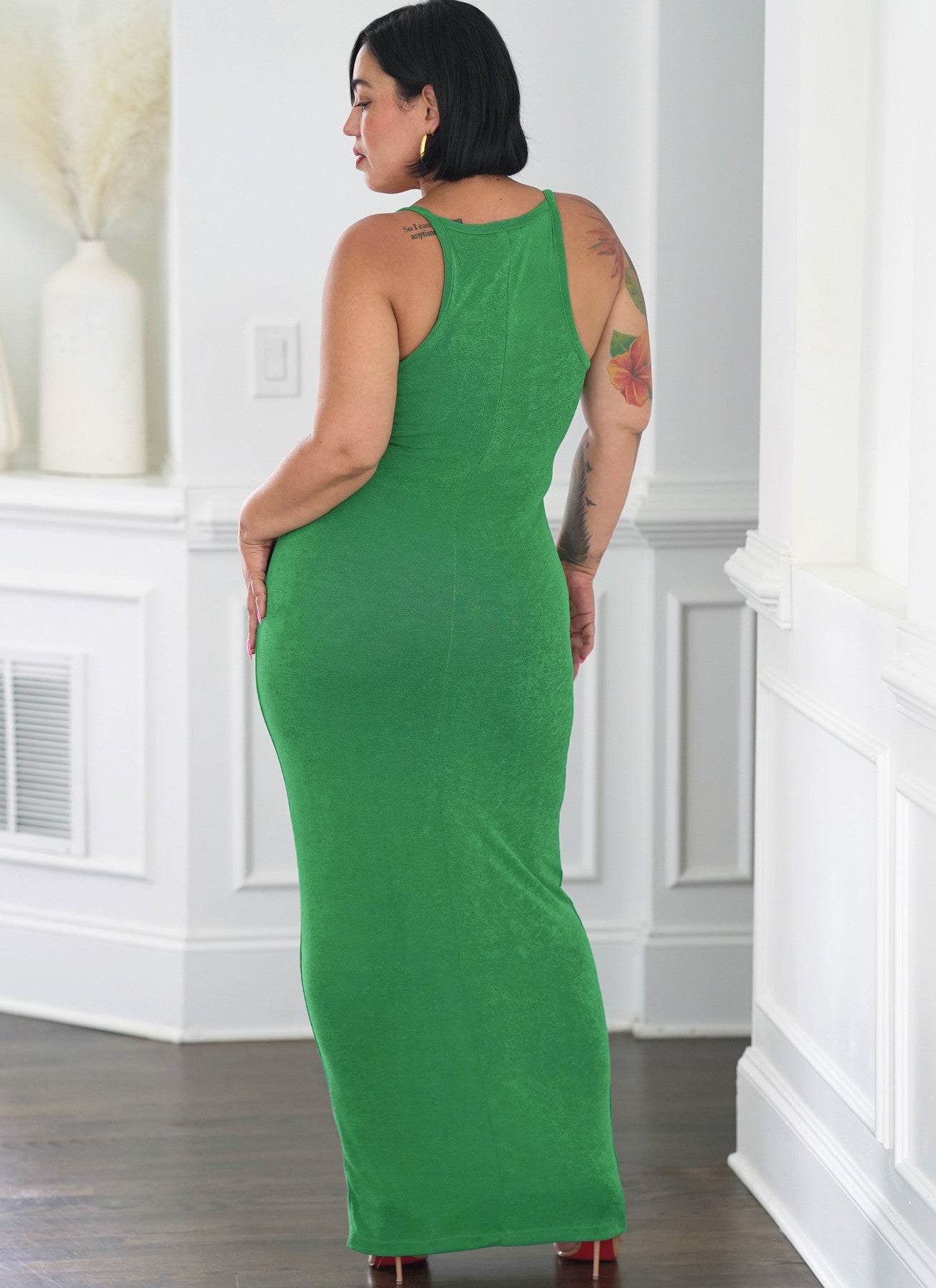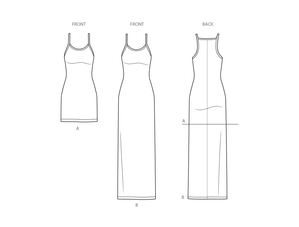 Close fit, knit dress pattern in short or long floor length has racer back tank, built in shelf bra and self-binding around the neckline and armholes.