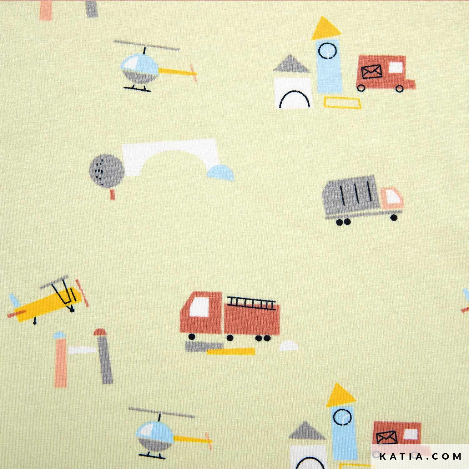 Fun jersey-type cotton fabric with illustrations of lorries, small planes, vans and all kinds of cars on a pastel yellow background. An exceptional print for making clothes for your little ones.